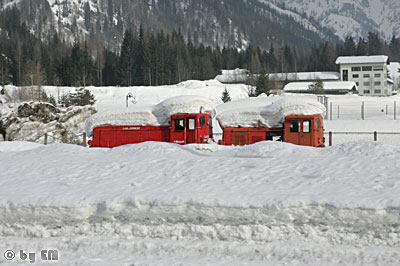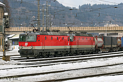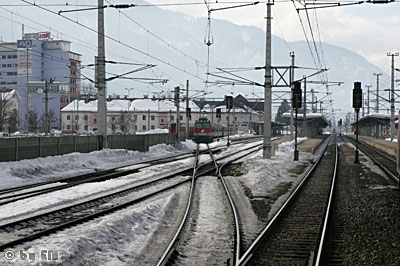 | Bhf Hochfilzen : 2 ex Jenbacher Dieselloks mit beachtlicher Schneebedeckung | Einfahrt in den Bhf Wörgl : in BIldmitte wartet 1144 260 mit R 5255 auf Abfahrt Ri Saalfelden, rechts die "Durchfahrtsbahnsteiggleise" 3 und 4 | |