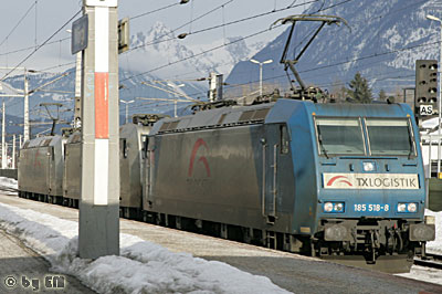 | 3-fach Glück in Wörgl bei der Heimreise : THX Lokzug mit 185 540+538 in Silber und der blauen 185 518 am Zugschluss muss auf Gl.2 eine Überholung abwarten ( sorry: konnte den Masten im rechten Bild leider nicht schnell genug umsägen -> also steht er leider fast mitten im Bild ) | ||